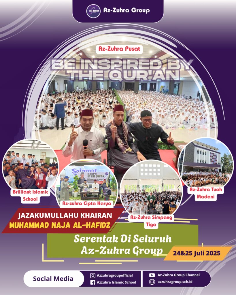 Az-Zuhra Group kembali menorehkan catatan emas dalam perjalanan dakwah dan pendidikannya. Sebagai bagian dari upaya memperkuat karakter Qur’ani di lingkungan sekolah, Az-Zuhra Group menyelenggarakan program bertajuk “Be Inspired by the Qur’an” yang menghadirkan sosok fenomenal dalam dunia tahfizh nasional, Muhammad Naja Al-Hafizh — hafizh Al-Qur’an 30 juz sekaligus inspirator muda umat Islam.